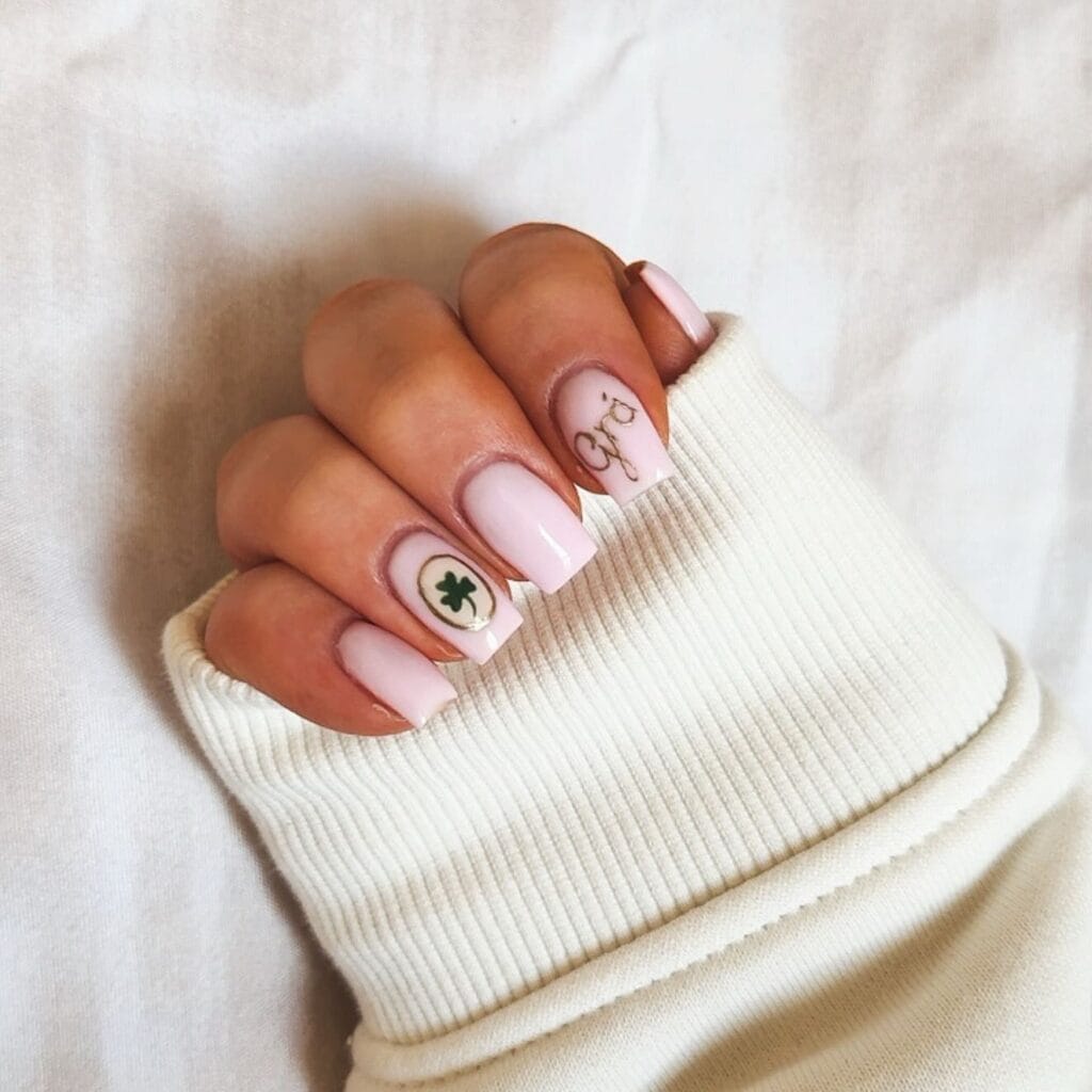 Sometimes simple is best, and this soft pink manicure with delicate gold “lucky” script and a single shamrock accent proves it. The minimalist approach is chic and wearable, with just enough festive detail to celebrate St. Patrick’s Day without going overboard. The gold lettering adds a touch of elegance, while the shamrock in a subtle circle frame keeps things playful. It’s perfect for anyone who wants a low-key nod to the holiday that still feels special and intentional.