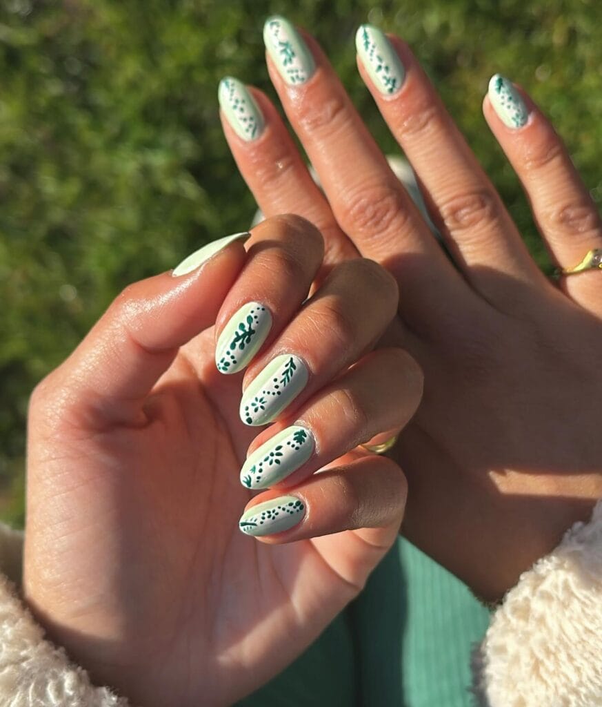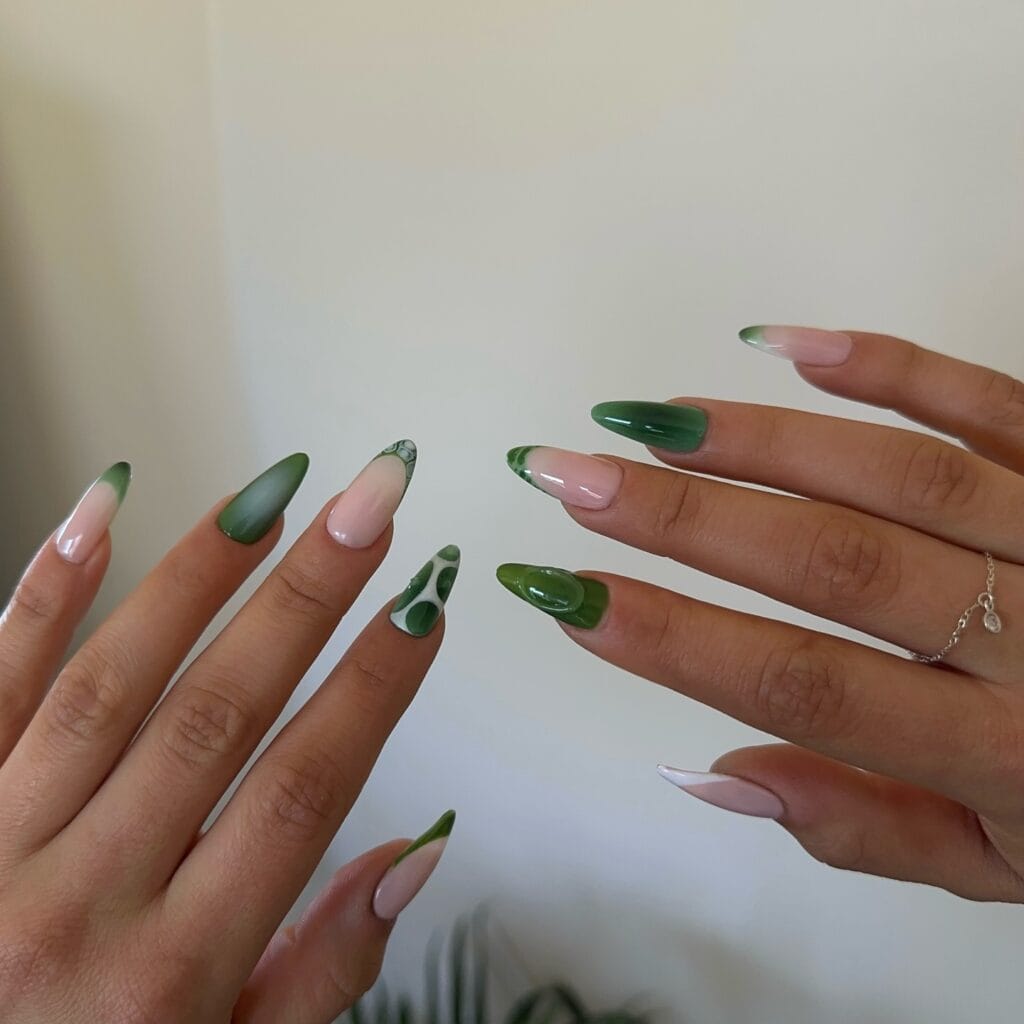 Mix light and dark shades of green in an alternating pattern for a playful, color-blocked look. You could do every other nail, or create a pattern with your accent fingers. The contrast between the different green tones adds visual interest while keeping the overall vibe cohesive and festive. It’s an easy way to incorporate multiple green shades into one cohesive design.