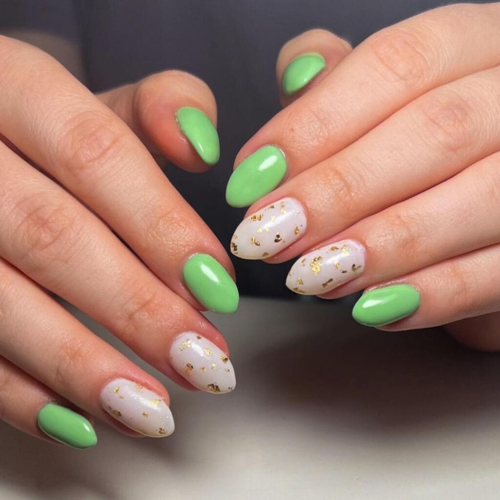 The combination of apple green, crisp white, and gold foil accents creates a luxe St. Patrick’s Day look that’s equal parts festive and elegant. The alternating colors keep things visually interesting, while the scattered gold foil adds that pot-of-gold shimmer. This design proves you don’t need elaborate nail art to make a statement! Sometimes a well-chosen color palette is all you need.