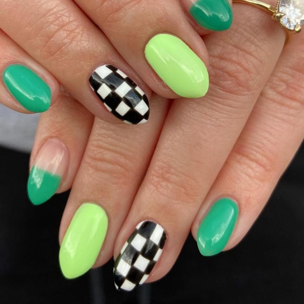 For those who like to mix their aesthetics, this set combines St. Patrick’s Day green with racing-inspired black and white checkered nails. The mix of emerald, neon lime, and graphic checkerboard creates an unexpectedly cool vibe that’s perfect for the edgy girls who still want to celebrate. It’s playful, bold, and completely unique, because who says St. Patrick’s Day nails have to be traditional?