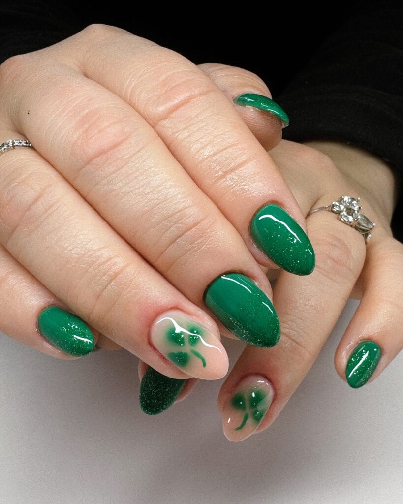 Start with a clear or nude base and gradually build up green glitter from the tips for a stunning ombre effect. The gradient sparkle is festive and fun without being too bold, making it perfect for anyone who loves a bit of shimmer. It catches the light beautifully and adds that extra special something to your St. Patrick’s Day look.