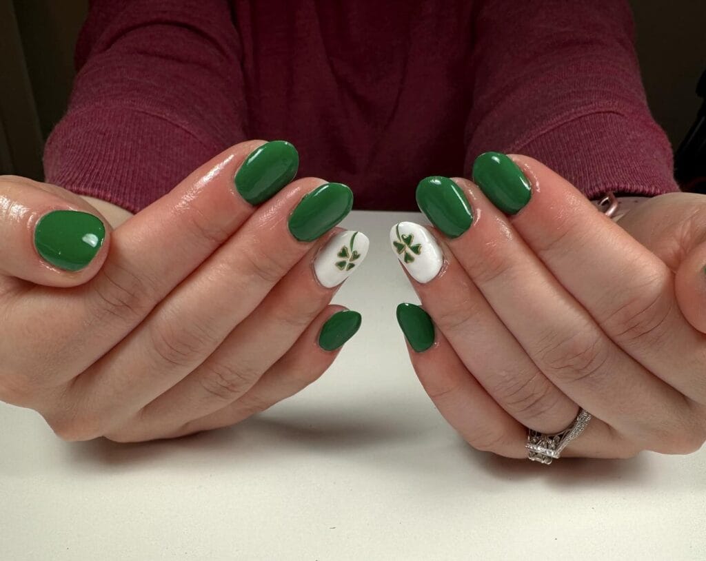 This gorgeous combination of deep forest green and creamy white is sophisticated and St. Patrick’s Day-appropriate. The shamrock nail art is perfectly placed for maximum impact without overwhelming the design, and the alternating colors create a balanced, polished look. It’s festive but refined—perfect for celebrating in style.