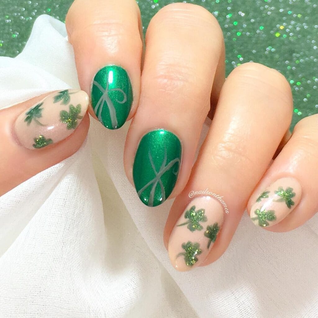 Give your St. Patrick’s Day mani a futuristic twist with green chrome nails. The reflective, mirror-like finish is incredibly eye-catching and adds a modern edge to the traditional holiday color. Whether you go for a deep emerald chrome or a lighter mint shade, the metallic finish will have everyone asking where you got your nails done.
