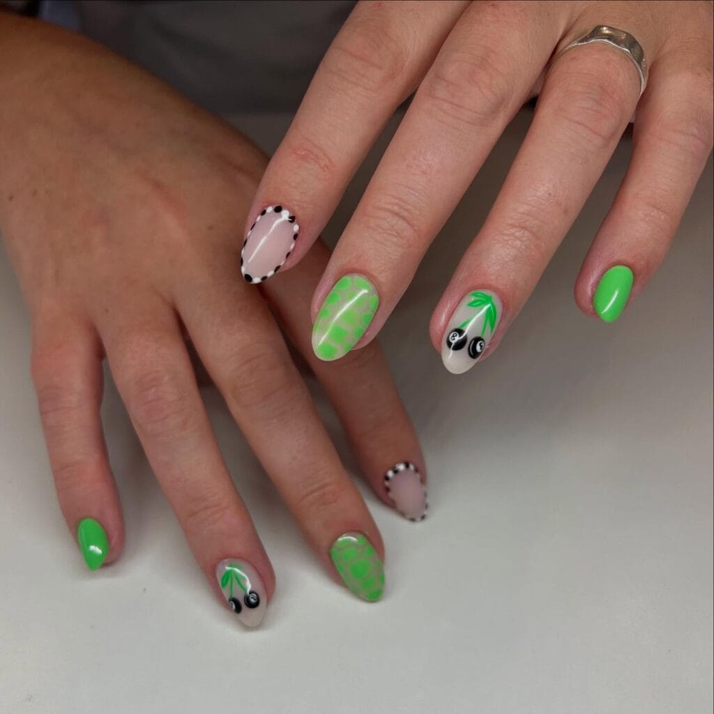 This playful set brings a fun, nostalgic twist to St. Patrick’s Day nails with neon green paired with magic 8 ball designs and graphic checkerboard accents on a nude base. The retro toy reference adds a playful, lucky vibe that perfectly fits the St. Patrick’s Day theme, because what’s luckier than a magic 8 ball telling you “yes”? It’s perfect for anyone who wants their St. Patrick’s Day nails to feel unique and conversation starting.