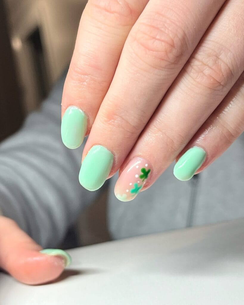 Who says St. Patrick’s Day nails have to be bright green? This soft mint shade with delicate floral details is perfect for anyone who prefers a more subtle, springtime approach to the holiday. The hand-painted flowers add a feminine, whimsical touch that feels fresh and modern. It’s ideal for the girls who want to celebrate without going full leprechaun.