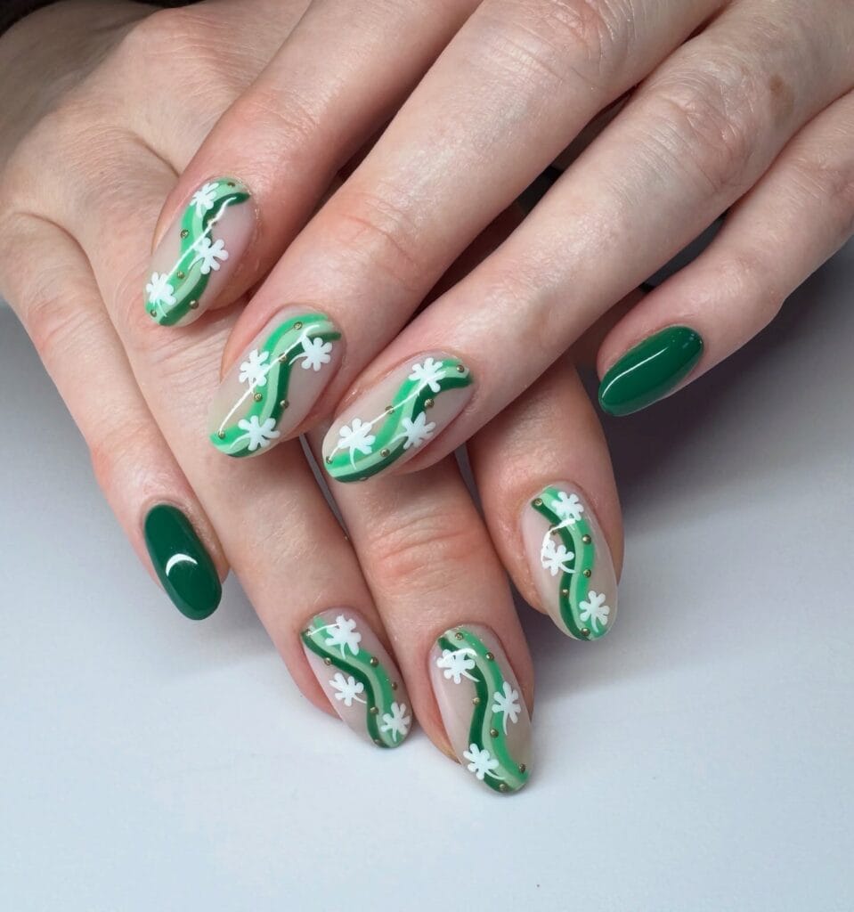 This dreamy design features green swirling patterns adorned with white shamrocks and gold studs on a nude base. The flowing green lines create movement and dimension, while the tiny shamrocks add a whimsical, garden-party vibe. It’s artistic, feminine, and perfect for anyone who wants their St. Patrick’s Day nails to feel more like wearable art than a costume.