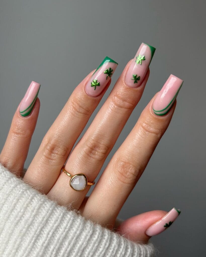 If you’re not ready to commit to full-on green nails but still want to celebrate, this pink and green combo is perfection. The soft pink base keeps things feminine and wearable, while the green french tips and tiny shamrock details add just the right amount of St. Patrick’s Day spirit. It’s festive without being over-the-top, making it ideal for anyone who wants a subtle nod to the holiday.