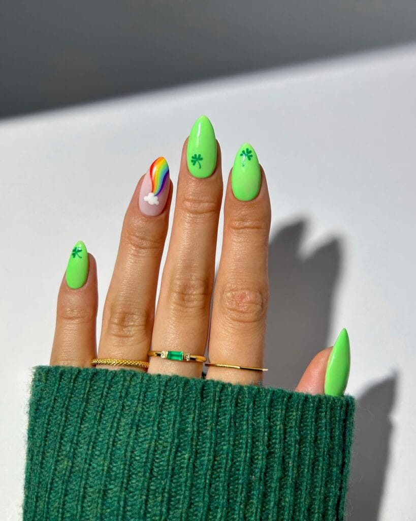 For the bold girls who aren’t afraid of color, these neon green nails are everything. The vibrant green is already a statement, but the addition of a rainbow accent nail takes it to the next level, because what’s St. Patrick’s Day without a little pot of gold? The shamrock details tie the whole look together, making this set perfect for anyone who wants to go all-in on the festivities.